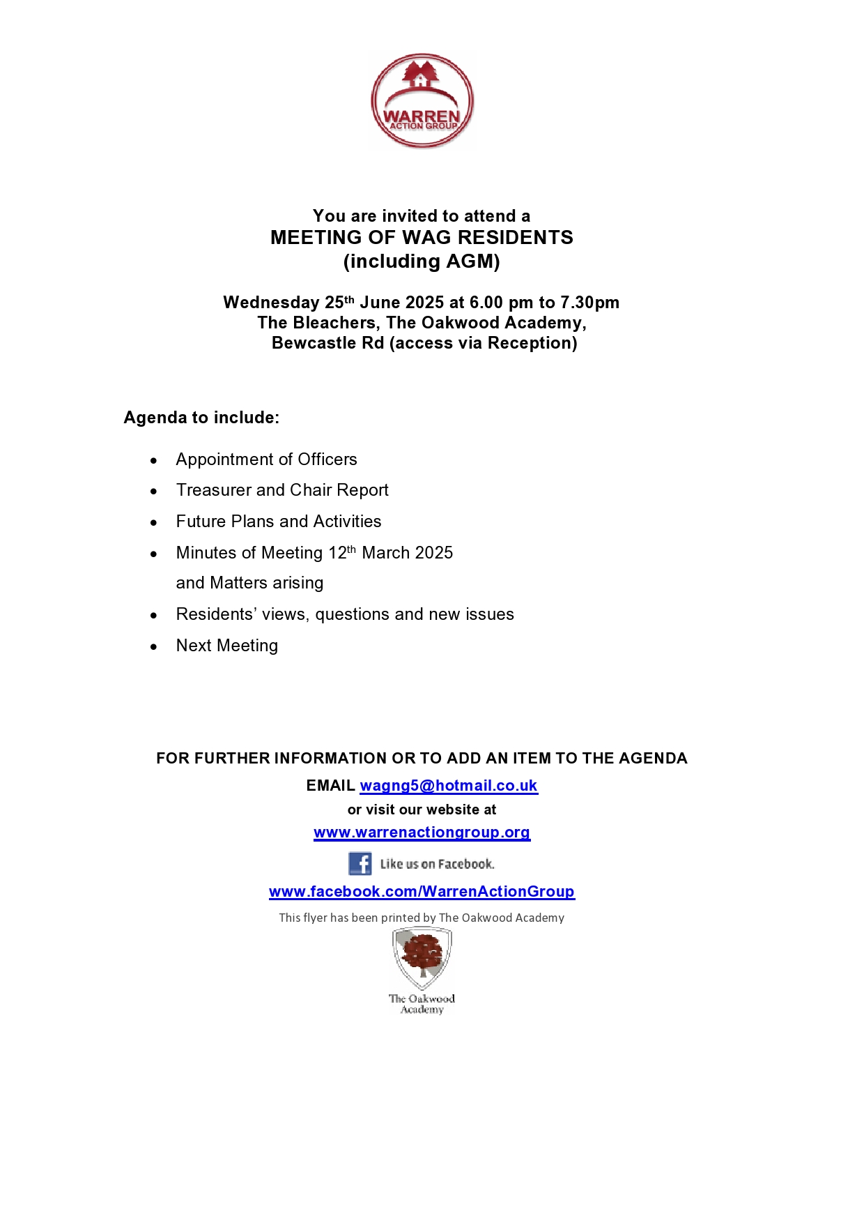 Meeting of WAG Residents (including AGM) Wednesday 25th June 2025 at 6 pm to 7.30 pm at The Bleachers, The Oakwood Academy, Bewcastle Road access via Reception